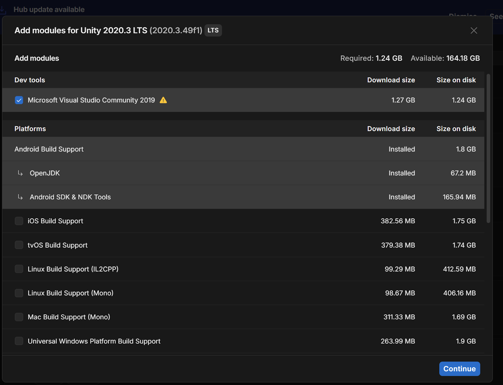 When installing Unity 2020.3.49f1, I selected the following modules: