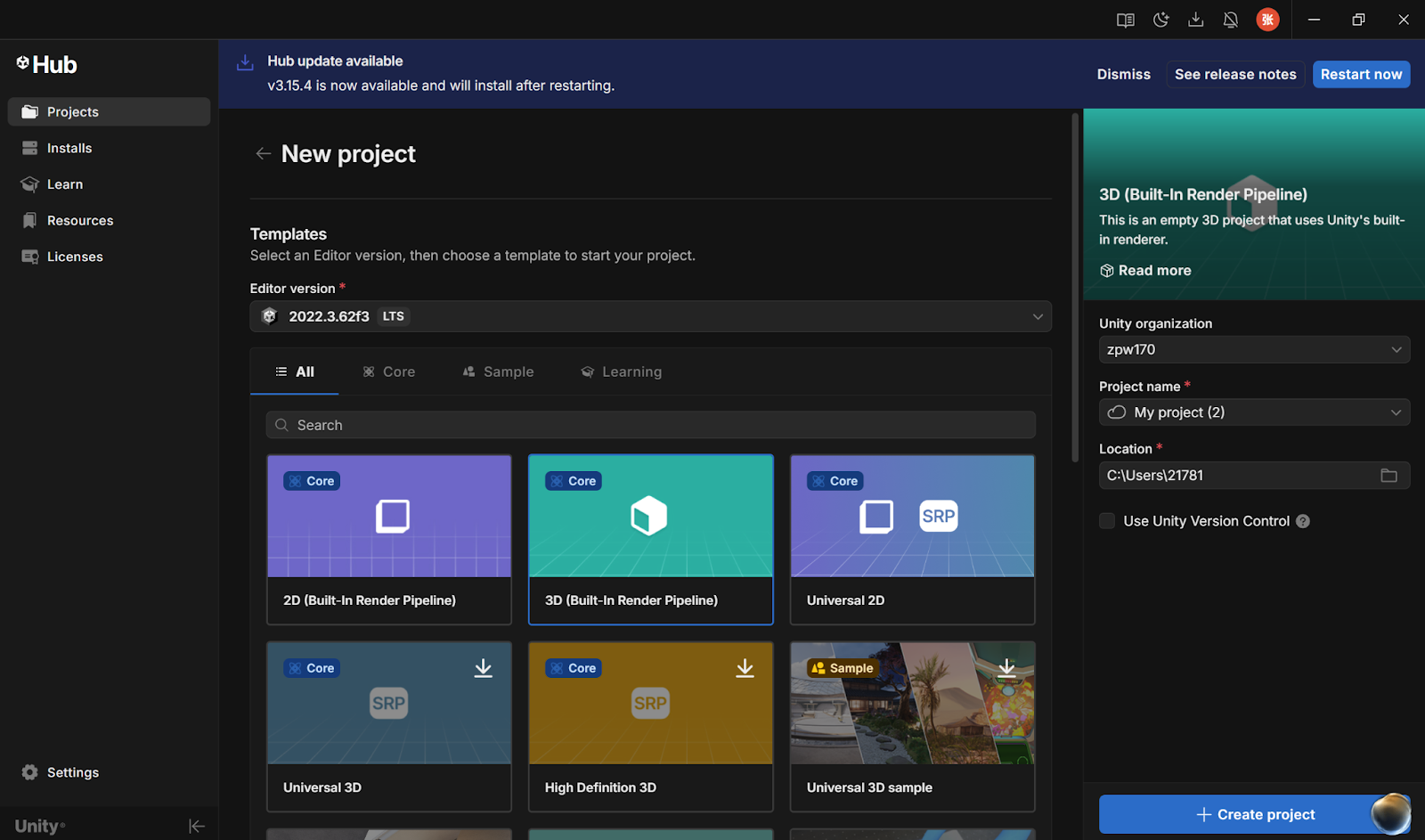 Unity was installed successfully, the required modules were added, and a new Unity project could run without errors.