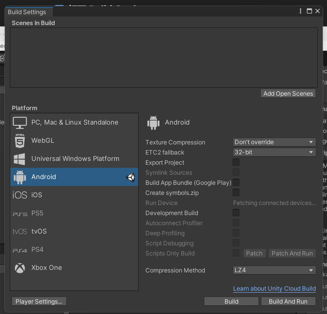 Unity: File > Build Settings > Android > Switch Platform