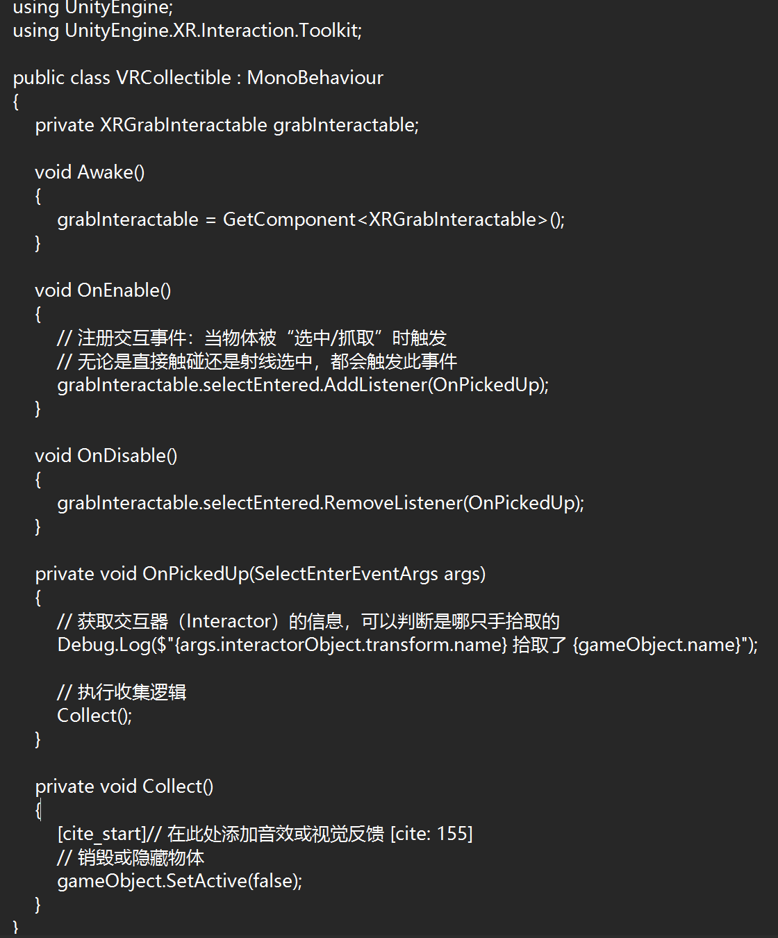 - Solution: I added the XR Grab Interactable component to all collectable items and set them to “Is Trigger” to prevent them from flying out due to physics collisions.